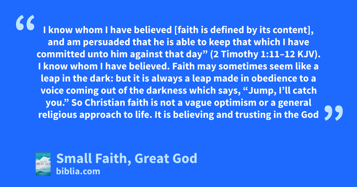 I know whom I have believed [faith is defined by its content], and am persuaded that he is able to keep that which I have committed unto him against that day” (2 Timothy 1:11–12 KJV). I know whom I have believed. Faith may sometimes seem like a leap in the dark: but it is always a leap made in obedience to a voice coming out of the darkness which says, “Jump, I’ll catch you.” So Christian faith is not a vague optimism or a general religious approach to life. It is believing and trusting in the God