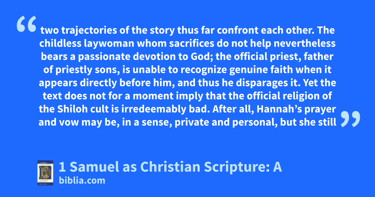 two trajectories of the story thus far confront each other. The childless laywoman whom sacrifices do not help nevertheless bears a passionate devotion to God; the official priest, father of priestly sons, is unable to recognize genuine faith when it appears directly before him, and thus he disparages it. Yet the text does not for a moment imply that the official religion of the Shiloh cult is irredeemably bad. After all, Hannah’s prayer and vow may be, in a sense, private and personal, but she still