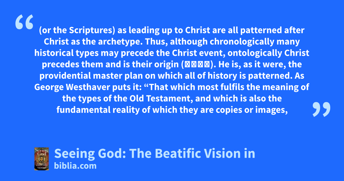 (or the Scriptures) as leading up to Christ are all patterned after Christ as the archetype. Thus, although chronologically many historical types may precede the Christ event, ontologically Christ precedes them and is their origin (ἀρχή). He is, as it were, the providential master plan on which all of history is patterned. As George Westhaver puts it: “That which most fulfils the meaning of the types of the Old Testament, and which is also the fundamental reality of which they are copies or images,
