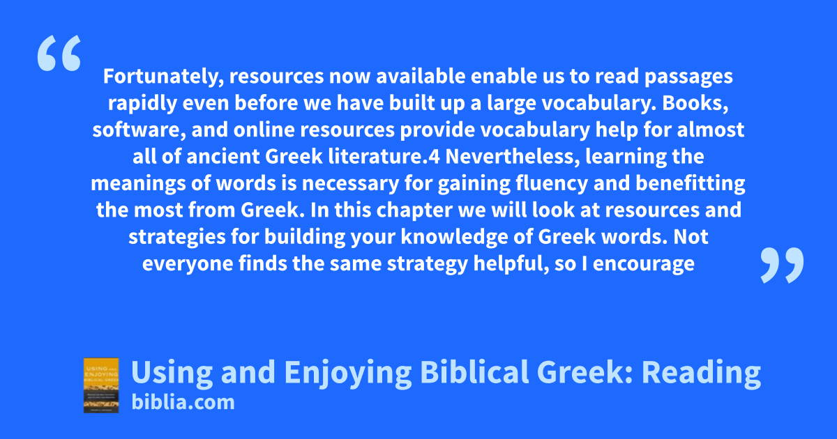 Fortunately, resources now available enable us to read passages rapidly even before we have built up a large vocabulary. Books, software, and online resources provide vocabulary help for almost all of ancient Greek literature.4 Nevertheless, learning the meanings of words is necessary for gaining fluency and benefitting the most from Greek. In this chapter we will look at resources and strategies for building your knowledge of Greek words. Not everyone finds the same strategy helpful, so I encourage