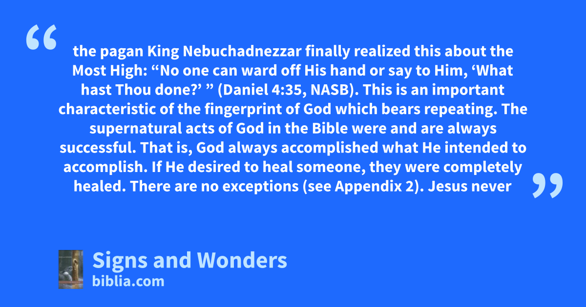 the pagan King Nebuchadnezzar finally realized this about the Most High: “No one can ward off His hand or say to Him, ‘What hast Thou done?’ ” (Daniel 4:35, NASB). This is an important characteristic of the fingerprint of God which bears repeating. The supernatural acts of God in the Bible were and are always successful. That is, God always accomplished what He intended to accomplish. If He desired to heal someone, they were completely healed. There are no exceptions (see Appendix 2). Jesus never