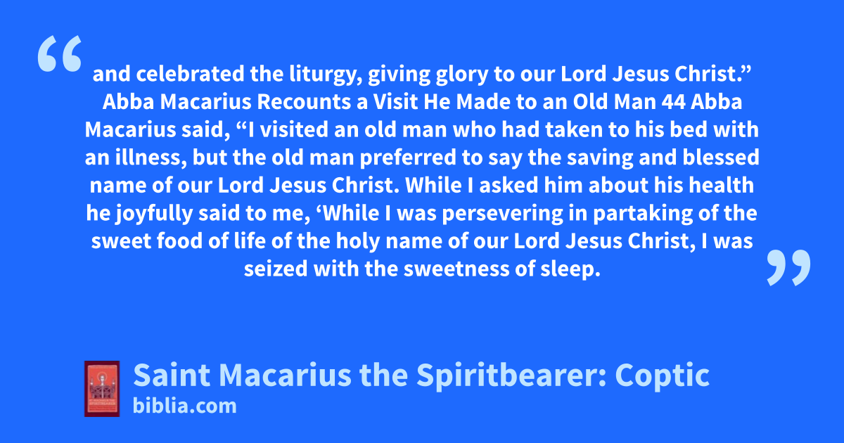 and celebrated the liturgy, giving glory to our Lord Jesus Christ.” Abba Macarius Recounts a Visit He Made to an Old Man 44 Abba Macarius said, “I visited an old man who had taken to his bed with an illness, but the old man preferred to say the saving and blessed name of our Lord Jesus Christ. While I asked him about his health he joyfully said to me, ‘While I was persevering in partaking of the sweet food of life of the holy name of our Lord Jesus Christ, I was seized with the sweetness of sleep.