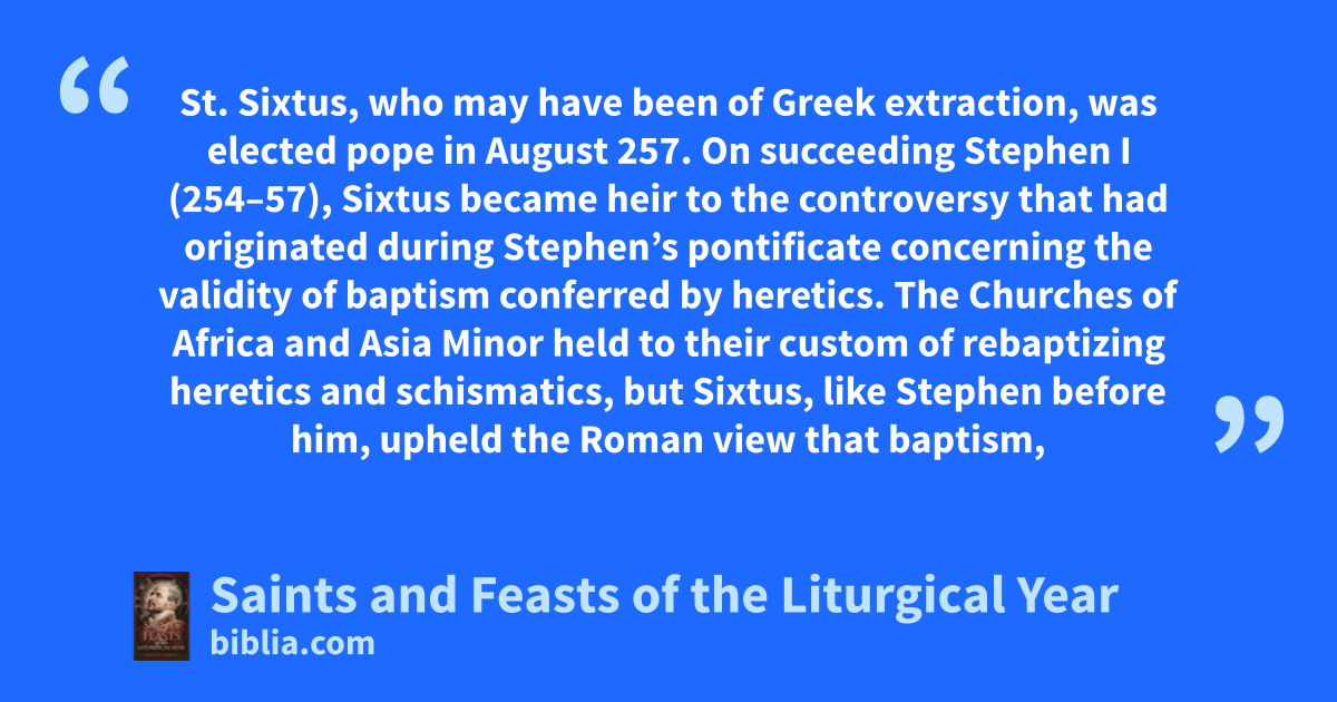 St. Sixtus, who may have been of Greek extraction, was elected pope in August 257. On succeeding Stephen I (254–57), Sixtus became heir to the controversy that had originated during Stephen’s pontificate concerning the validity of baptism conferred by heretics. The Churches of Africa and Asia Minor held to their custom of rebaptizing heretics and schismatics, but Sixtus, like Stephen before him, upheld the Roman view that baptism,
