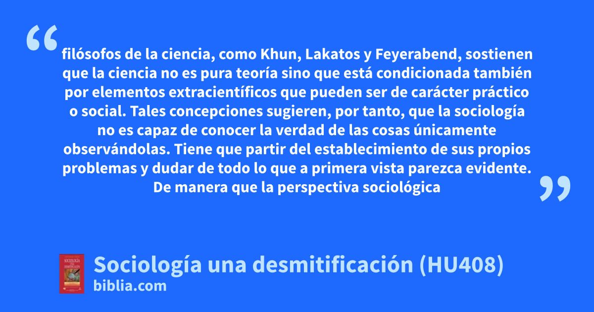 filósofos de la ciencia, como Khun, Lakatos y Feyerabend, sostienen que la ciencia no es pura teoría sino que está condicionada también por elementos extracientíficos que pueden ser de carácter práctico o social. Tales concepciones sugieren, por tanto, que la sociología no es capaz de conocer la verdad de las cosas únicamente observándolas. Tiene que partir del establecimiento de sus propios problemas y dudar de todo lo que a primera vista parezca evidente. De manera que la perspectiva sociológica