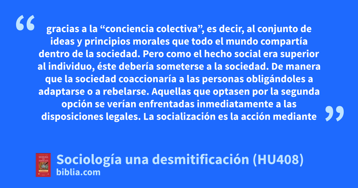 gracias a la “conciencia colectiva”, es decir, al conjunto de ideas y principios morales que todo el mundo compartía dentro de la sociedad. Pero como el hecho social era superior al individuo, éste debería someterse a la sociedad. De manera que la sociedad coaccionaría a las personas obligándoles a adaptarse o a rebelarse. Aquellas que optasen por la segunda opción se verían enfrentadas inmediatamente a las disposiciones legales. La socialización es la acción mediante