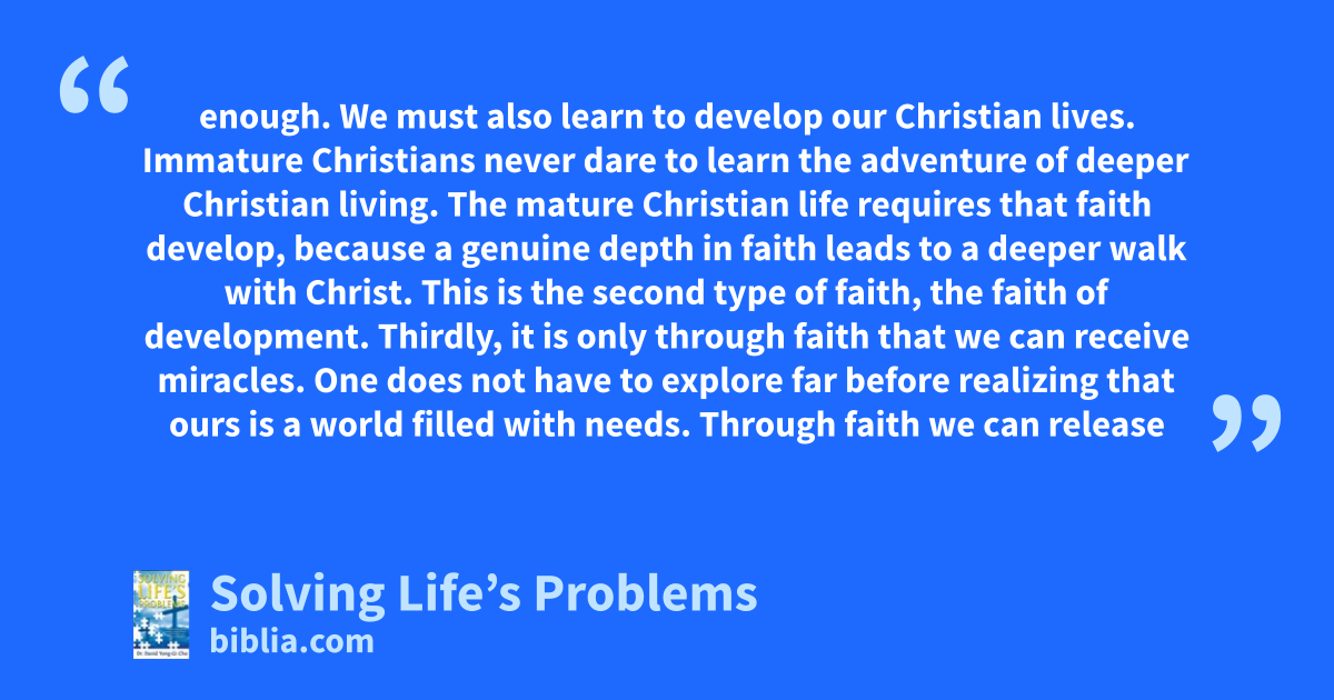 enough. We must also learn to develop our Christian lives. Immature Christians never dare to learn the adventure of deeper Christian living. The mature Christian life requires that faith develop, because a genuine depth in faith leads to a deeper walk with Christ. This is the second type of faith, the faith of development. Thirdly, it is only through faith that we can receive miracles. One does not have to explore far before realizing that ours is a world filled with needs. Through faith we can release