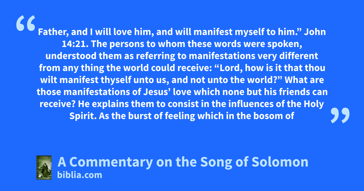 Father, and I will love him, and will manifest myself to him.” John 14:21. The persons to whom these words were spoken, understood them as referring to manifestations very different from any thing the world could receive: “Lord, how is it that thou wilt manifest thyself unto us, and not unto the world?” What are those manifestations of Jesus’ love which none but his friends can receive? He explains them to consist in the influences of the Holy Spirit. As the burst of feeling which in the bosom of