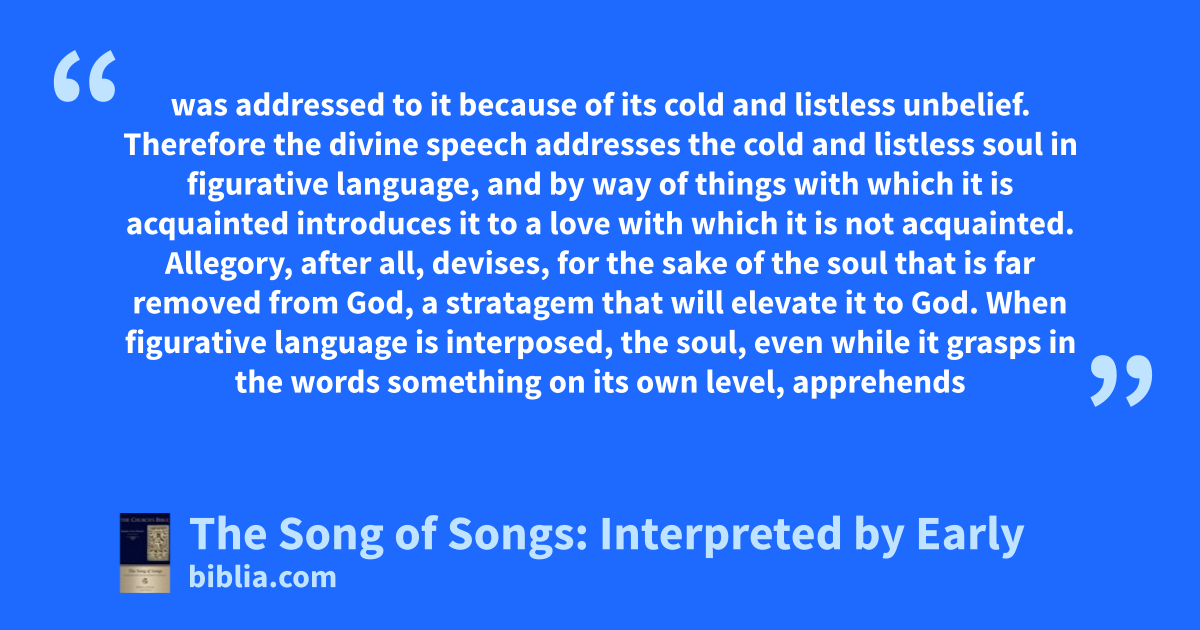 was addressed to it because of its cold and listless unbelief. Therefore the divine speech addresses the cold and listless soul in figurative language, and by way of things with which it is acquainted introduces it to a love with which it is not acquainted. Allegory, after all, devises, for the sake of the soul that is far removed from God, a stratagem that will elevate it to God. When figurative language is interposed, the soul, even while it grasps in the words something on its own level, apprehends