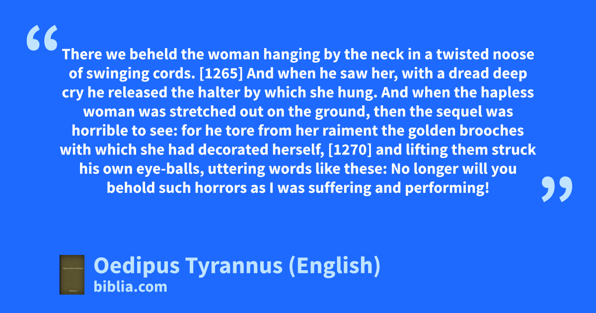 There we beheld the woman hanging by the neck in a twisted noose of swinging cords. [1265] And when he saw her, with a dread deep cry he released the halter by which she hung. And when the hapless woman was stretched out on the ground, then the sequel was horrible to see: for he tore from her raiment the golden brooches with which she had decorated herself, [1270] and lifting them struck his own eye-balls, uttering words like these: No longer will you behold such horrors as I was suffering and performing!