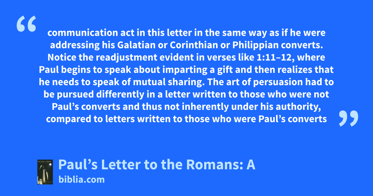 communication act in this letter in the same way as if he were addressing his Galatian or Corinthian or Philippian converts. Notice the readjustment evident in verses like 1:11–12, where Paul begins to speak about imparting a gift and then realizes that he needs to speak of mutual sharing. The art of persuasion had to be pursued differently in a letter written to those who were not Paul’s converts and thus not inherently under his authority, compared to letters written to those who were Paul’s converts