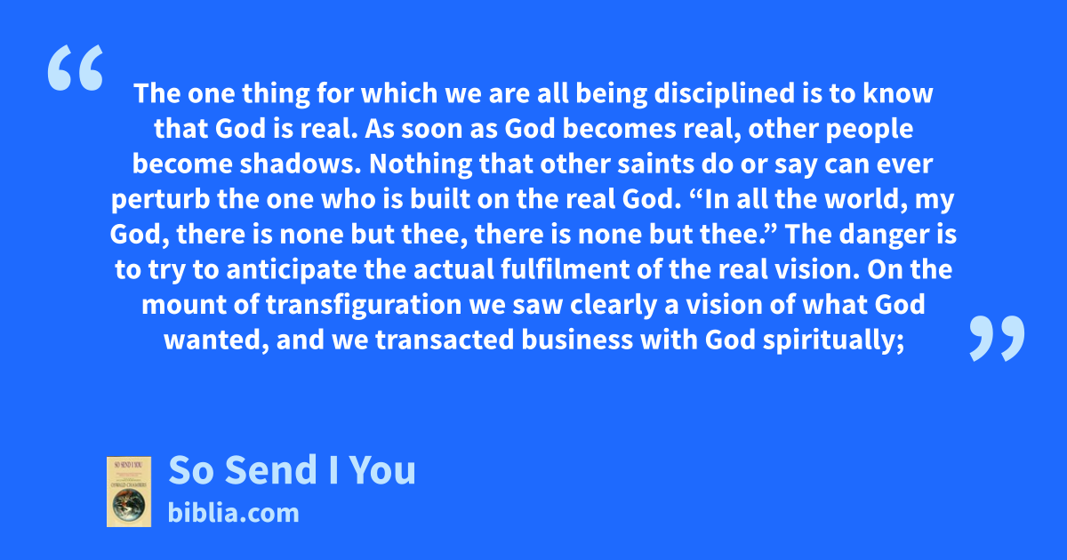 The one thing for which we are all being disciplined is to know that God is real. As soon as God becomes real, other people become shadows. Nothing that other saints do or say can ever perturb the one who is built on the real God. “In all the world, my God, there is none but thee, there is none but thee.” The danger is to try to anticipate the actual fulfilment of the real vision. On the mount of transfiguration we saw clearly a vision of what God wanted, and we transacted business with God spiritually;