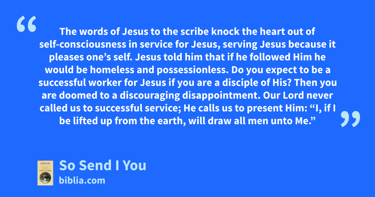 The words of Jesus to the scribe knock the heart out of self-consciousness in service for Jesus, serving Jesus because it pleases one’s self. Jesus told him that if he followed Him he would be homeless and possessionless. Do you expect to be a successful worker for Jesus if you are a disciple of His? Then you are doomed to a discouraging disappointment. Our Lord never called us to successful service; He calls us to present Him: “I, if I be lifted up from the earth, will draw all men unto Me.”