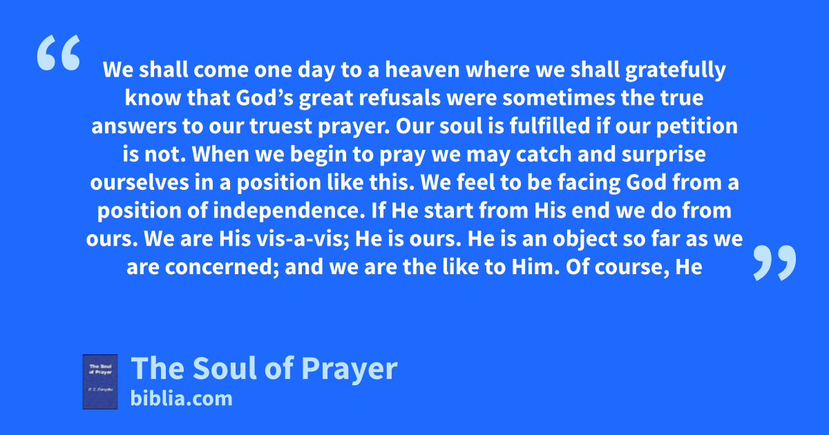 We shall come one day to a heaven where we shall gratefully know that God’s great refusals were sometimes the true answers to our truest prayer. Our soul is fulfilled if our petition is not. When we begin to pray we may catch and surprise ourselves in a position like this. We feel to be facing God from a position of independence. If He start from His end we do from ours. We are His vis-a-vis; He is ours. He is an object so far as we are concerned; and we are the like to Him. Of course, He