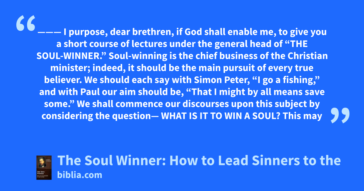 ——— I purpose, dear brethren, if God shall enable me, to give you a short course of lectures under the general head of “THE SOUL-WINNER.” Soul-winning is the chief business of the Christian minister; indeed, it should be the main pursuit of every true believer. We should each say with Simon Peter, “I go a fishing,” and with Paul our aim should be, “That I might by all means save some.” We shall commence our discourses upon this subject by considering the question— WHAT IS IT TO WIN A SOUL? This may