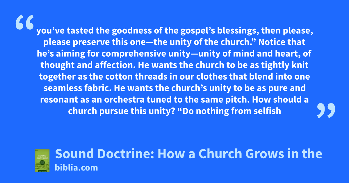 you’ve tasted the goodness of the gospel’s blessings, then please, please preserve this one—the unity of the church.” Notice that he’s aiming for comprehensive unity—unity of mind and heart, of thought and affection. He wants the church to be as tightly knit together as the cotton threads in our clothes that blend into one seamless fabric. He wants the church’s unity to be as pure and resonant as an orchestra tuned to the same pitch. How should a church pursue this unity? “Do nothing from selfish