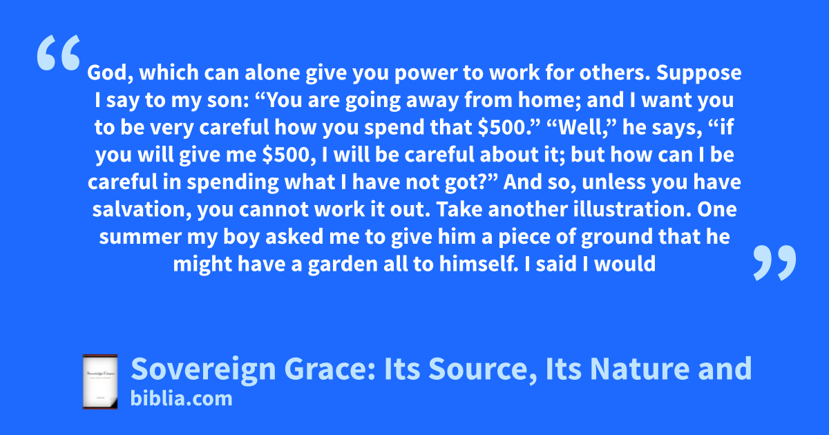 Sovereign Grace: Its Source, Its Nature, and Its Effects is a collection of address by D. L. Moody focused on various aspects of the doctrine of grace. This volume also contains the Moody’s Gospel Dialogues: “What It is to Be a Child of God,” “How to Become a Christian,” and “What It is to Be Converted.”