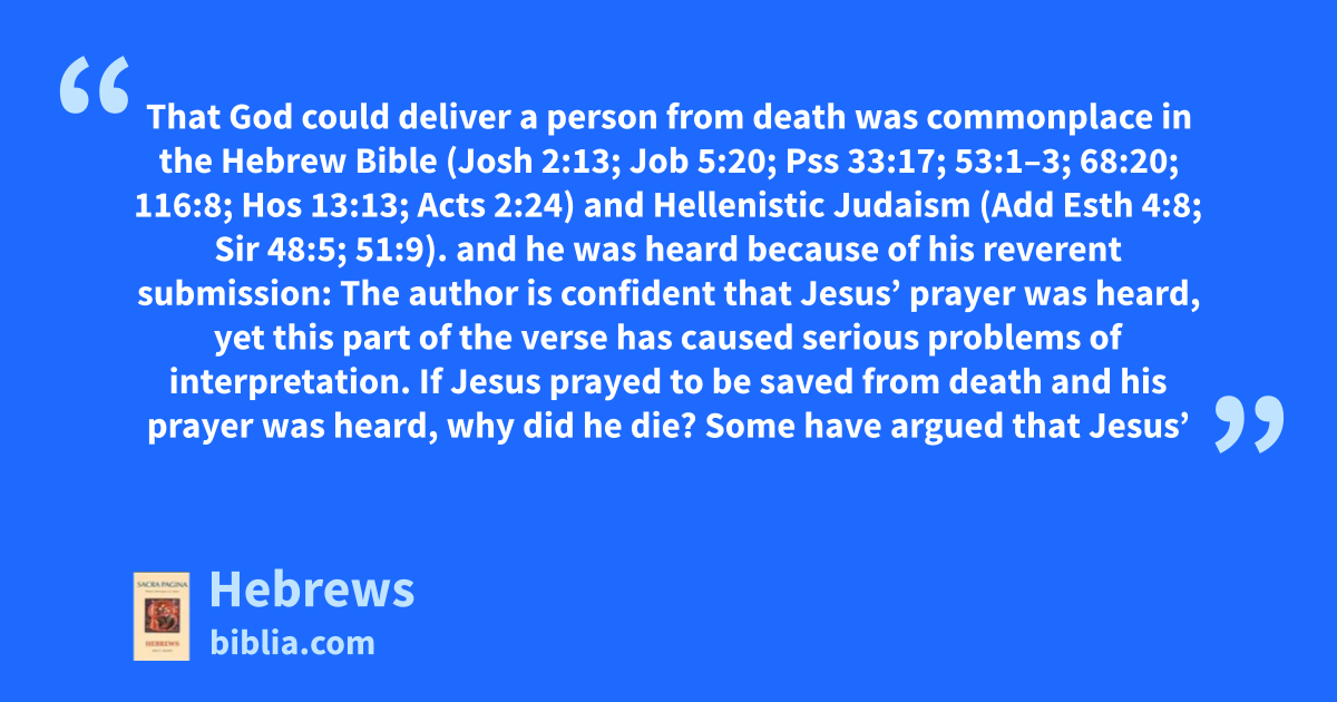 That God could deliver a person from death was commonplace in the Hebrew Bible (Josh 2:13; Job 5:20; Pss 33:17; 53:1–3; 68:20; 116:8; Hos 13:13; Acts 2:24) and Hellenistic Judaism (Add Esth 4:8; Sir 48:5; 51:9). and he was heard because of his reverent submission: The author is confident that Jesus’ prayer was heard, yet this part of the verse has caused serious problems of interpretation. If Jesus prayed to be saved from death and his prayer was heard, why did he die? Some have argued that Jesus’