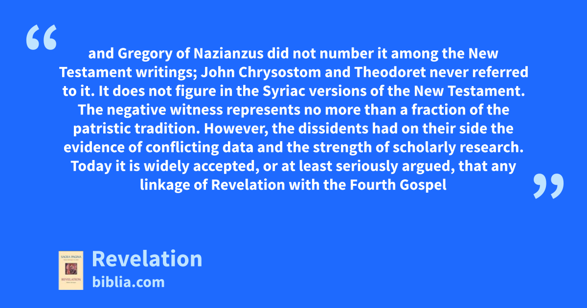 and Gregory of Nazianzus did not number it among the New Testament writings; John Chrysostom and Theodoret never referred to it. It does not figure in the Syriac versions of the New Testament. The negative witness represents no more than a fraction of the patristic tradition. However, the dissidents had on their side the evidence of conflicting data and the strength of scholarly research. Today it is widely accepted, or at least seriously argued, that any linkage of Revelation with the Fourth Gospel