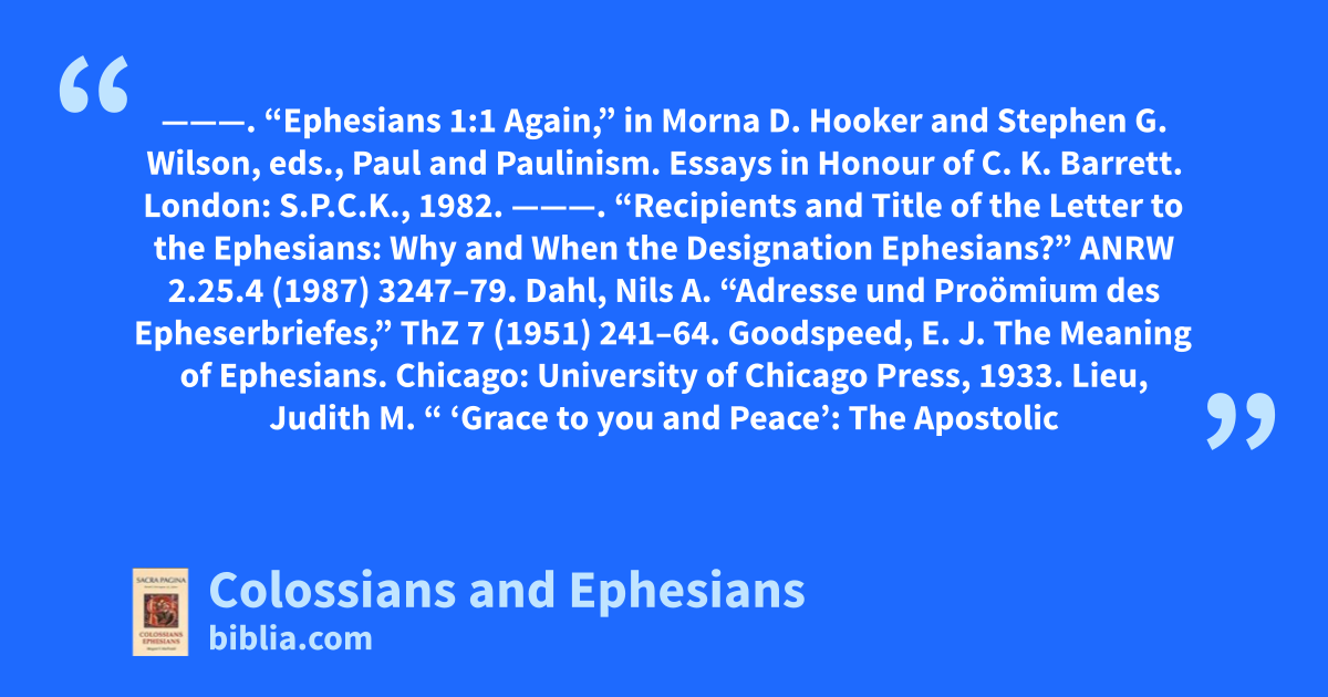 ———. “Ephesians 1:1 Again,” in Morna D. Hooker and Stephen G. Wilson, eds., Paul and Paulinism. Essays in Honour of C. K. Barrett. London: S.P.C.K., 1982. ———. “Recipients and Title of the Letter to the Ephesians: Why and When the Designation Ephesians?” ANRW 2.25.4 (1987) 3247–79. Dahl, Nils A. “Adresse und Proömium des Epheserbriefes,” ThZ 7 (1951) 241–64. Goodspeed, E. J. The Meaning of Ephesians. Chicago: University of Chicago Press, 1933. Lieu, Judith M. “ ‘Grace to you and Peace’: The Apostolic