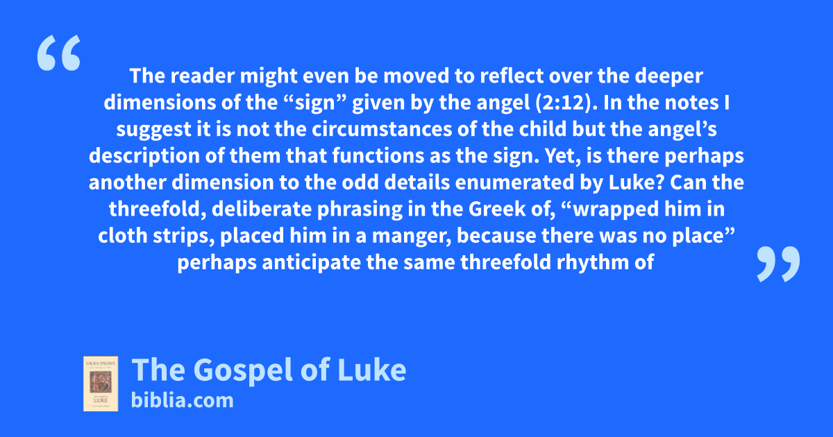The reader might even be moved to reflect over the deeper dimensions of the “sign” given by the angel (2:12). In the notes I suggest it is not the circumstances of the child but the angel’s description of them that functions as the sign. Yet, is there perhaps another dimension to the odd details enumerated by Luke? Can the threefold, deliberate phrasing in the Greek of, “wrapped him in cloth strips, placed him in a manger, because there was no place” perhaps anticipate the same threefold rhythm of