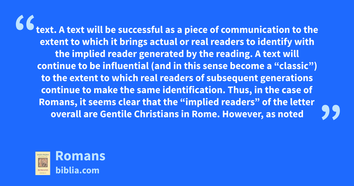 text. A text will be successful as a piece of communication to the extent to which it brings actual or real readers to identify with the implied reader generated by the reading. A text will continue to be influential (and in this sense become a “classic”) to the extent to which real readers of subsequent generations continue to make the same identification. Thus, in the case of Romans, it seems clear that the “implied readers” of the letter overall are Gentile Christians in Rome. However, as noted