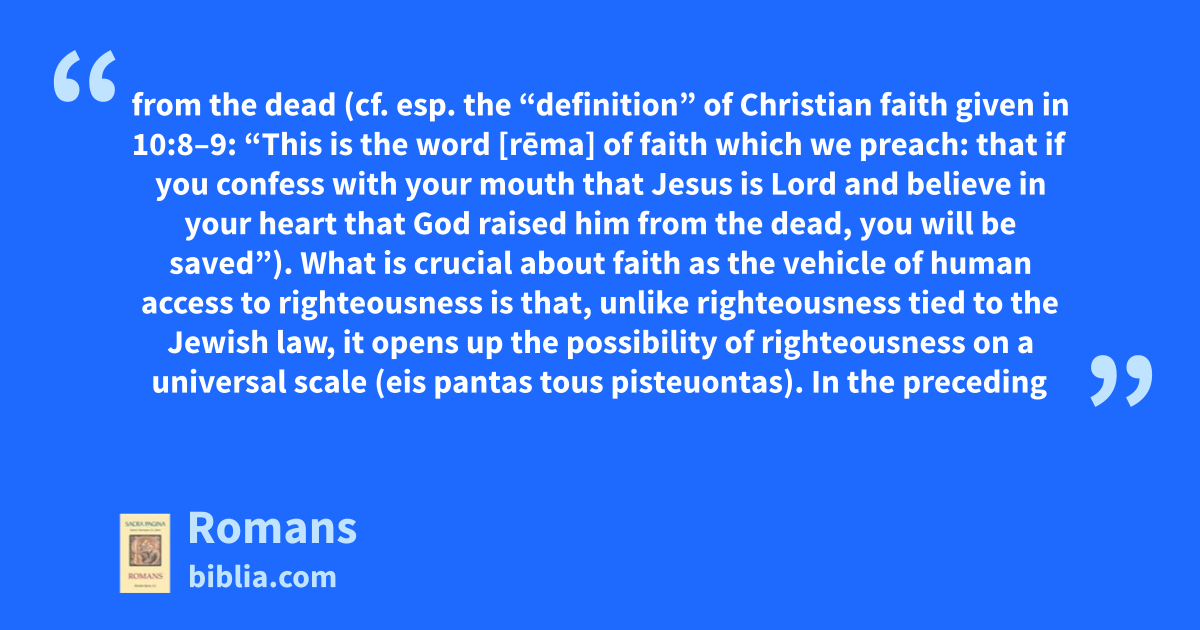 from the dead (cf. esp. the “definition” of Christian faith given in 10:8–9: “This is the word [rēma] of faith which we preach: that if you confess with your mouth that Jesus is Lord and believe in your heart that God raised him from the dead, you will be saved”). What is crucial about faith as the vehicle of human access to righteousness is that, unlike righteousness tied to the Jewish law, it opens up the possibility of righteousness on a universal scale (eis pantas tous pisteuontas). In the preceding