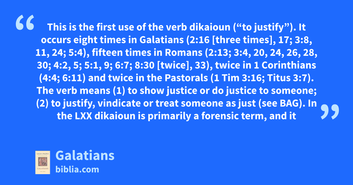 This is the first use of the verb dikaioun (“to justify”). It occurs eight times in Galatians (2:16 [three times], 17; 3:8, 11, 24; 5:4), fifteen times in Romans (2:13; 3:4, 20, 24, 26, 28, 30; 4:2, 5; 5:1, 9; 6:7; 8:30 [twice], 33), twice in 1 Corinthians (4:4; 6:11) and twice in the Pastorals (1 Tim 3:16; Titus 3:7). The verb means (1) to show justice or do justice to someone; (2) to justify, vindicate or treat someone as just (see BAG). In the LXX dikaioun is primarily a forensic term, and it