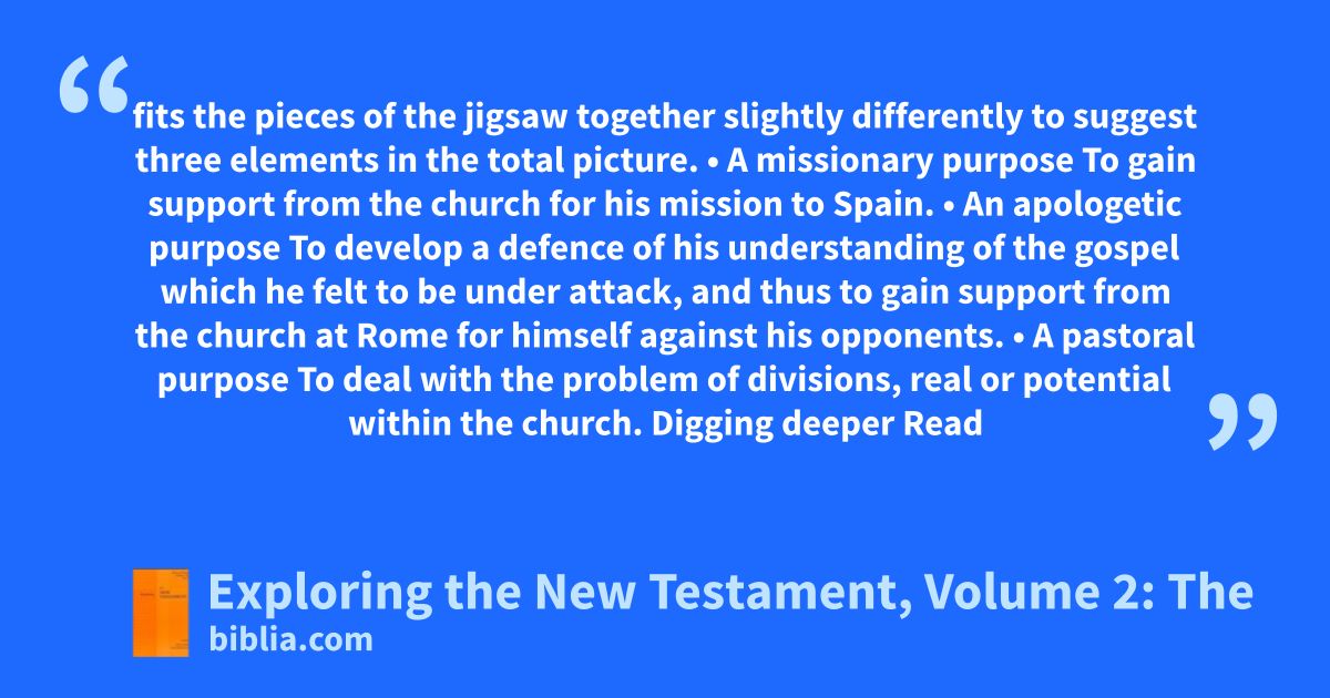 fits the pieces of the jigsaw together slightly differently to suggest three elements in the total picture. • A missionary purpose To gain support from the church for his mission to Spain. • An apologetic purpose To develop a defence of his understanding of the gospel which he felt to be under attack, and thus to gain support from the church at Rome for himself against his opponents. • A pastoral purpose To deal with the problem of divisions, real or potential within the church. Digging deeper Read