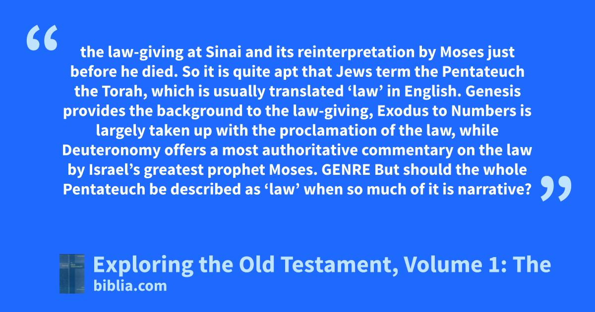 the law-giving at Sinai and its reinterpretation by Moses just before he died. So it is quite apt that Jews term the Pentateuch the Torah, which is usually translated ‘law’ in English. Genesis provides the background to the law-giving, Exodus to Numbers is largely taken up with the proclamation of the law, while Deuteronomy offers a most authoritative commentary on the law by Israel’s greatest prophet Moses. GENRE But should the whole Pentateuch be described as ‘law’ when so much of it is narrative?