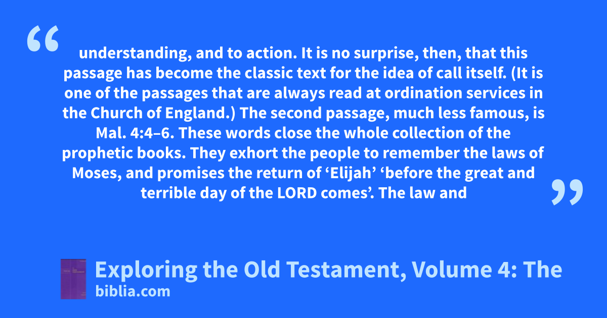 understanding, and to action. It is no surprise, then, that this passage has become the classic text for the idea of call itself. (It is one of the passages that are always read at ordination services in the Church of England.) The second passage, much less famous, is Mal. 4:4–6. These words close the whole collection of the prophetic books. They exhort the people to remember the laws of Moses, and promises the return of ‘Elijah’ ‘before the great and terrible day of the LORD comes’. The law and