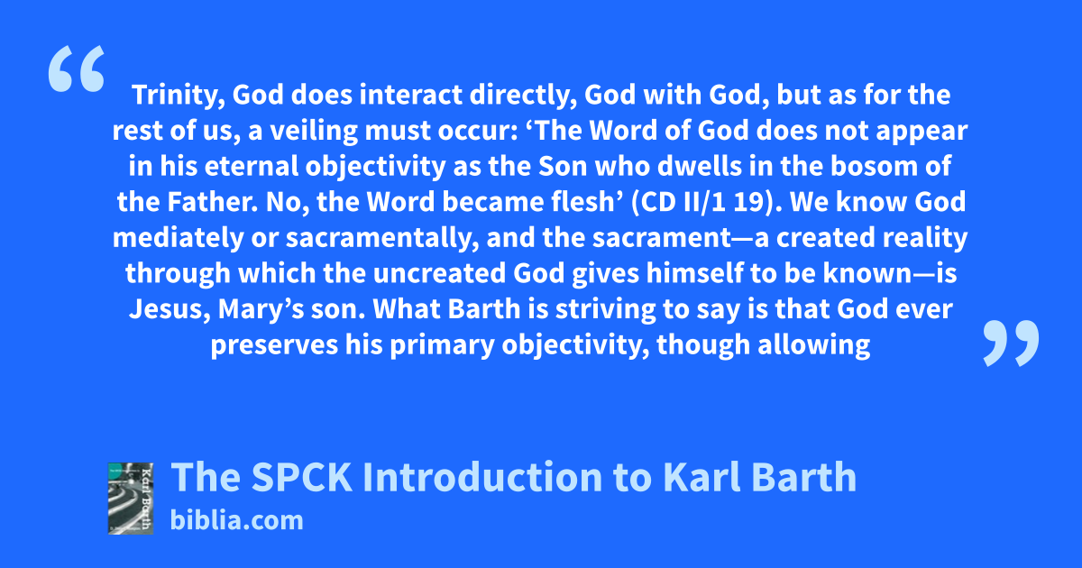 Trinity, God does interact directly, God with God, but as for the rest of us, a veiling must occur: ‘The Word of God does not appear in his eternal objectivity as the Son who dwells in the bosom of the Father. No, the Word became flesh’ (CD II/1 19). We know God mediately or sacramentally, and the sacrament—a created reality through which the uncreated God gives himself to be known—is Jesus, Mary’s son. What Barth is striving to say is that God ever preserves his primary objectivity, though allowing