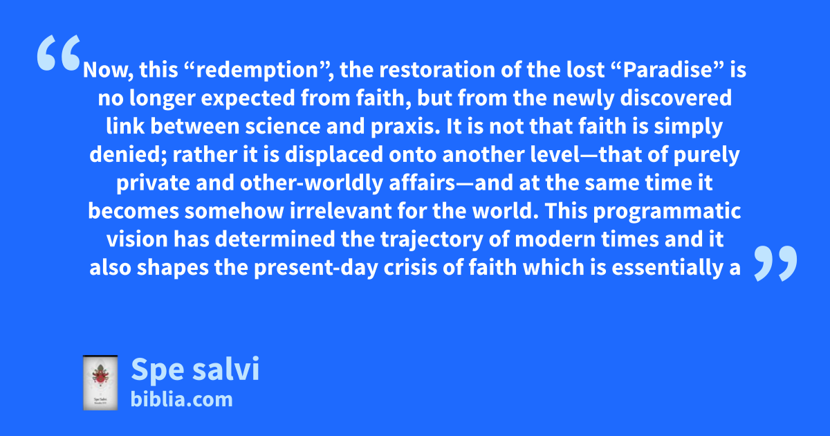 Now, this “redemption”, the restoration of the lost “Paradise” is no longer expected from faith, but from the newly discovered link between science and praxis. It is not that faith is simply denied; rather it is displaced onto another level—that of purely private and other-worldly affairs—and at the same time it becomes somehow irrelevant for the world. This programmatic vision has determined the trajectory of modern times and it also shapes the present-day crisis of faith which is essentially a