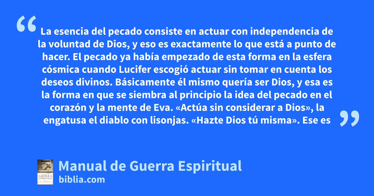 La esencia del pecado consiste en actuar con independencia de la voluntad de Dios, y eso es exactamente lo que está a punto de hacer. El pecado ya había empezado de esta forma en la esfera cósmica cuando Lucifer escogió actuar sin tomar en cuenta los deseos divinos. Básicamente él mismo quería ser Dios, y esa es la forma en que se siembra al principio la idea del pecado en el corazón y la mente de Eva. «Actúa sin considerar a Dios», la engatusa el diablo con lisonjas. «Hazte Dios tú misma». Ese es