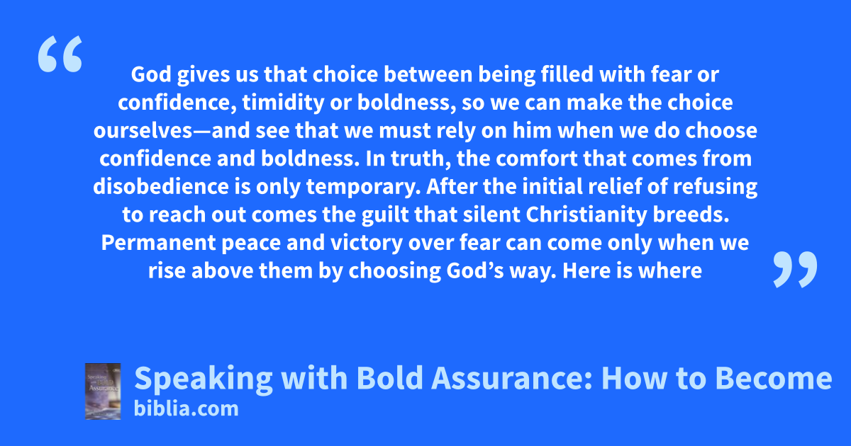 God gives us that choice between being filled with fear or confidence, timidity or boldness, so we can make the choice ourselves—and see that we must rely on him when we do choose confidence and boldness. In truth, the comfort that comes from disobedience is only temporary. After the initial relief of refusing to reach out comes the guilt that silent Christianity breeds. Permanent peace and victory over fear can come only when we rise above them by choosing God’s way. Here is where