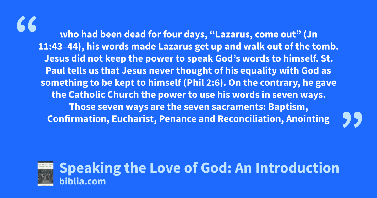 who had been dead for four days, “Lazarus, come out” (Jn 11:43–44), his words made Lazarus get up and walk out of the tomb. Jesus did not keep the power to speak God’s words to himself. St. Paul tells us that Jesus never thought of his equality with God as something to be kept to himself (Phil 2:6). On the contrary, he gave the Catholic Church the power to use his words in seven ways. Those seven ways are the seven sacraments: Baptism, Confirmation, Eucharist, Penance and Reconciliation, Anointing