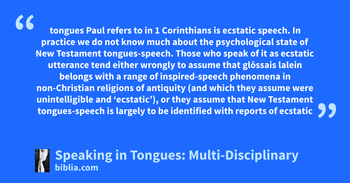 tongues Paul refers to in 1 Corinthians is ecstatic speech. In practice we do not know much about the psychological state of New Testament tongues-speech. Those who speak of it as ecstatic utterance tend either wrongly to assume that glōssais lalein belongs with a range of inspired-speech phenomena in non-Christian religions of antiquity (and which they assume were unintelligible and ‘ecstatic’), or they assume that New Testament tongues-speech is largely to be identified with reports of ecstatic