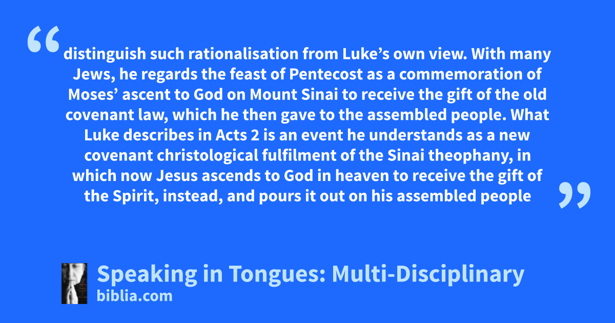 distinguish such rationalisation from Luke’s own view. With many Jews, he regards the feast of Pentecost as a commemoration of Moses’ ascent to God on Mount Sinai to receive the gift of the old covenant law, which he then gave to the assembled people. What Luke describes in Acts 2 is an event he understands as a new covenant christological fulfilment of the Sinai theophany, in which now Jesus ascends to God in heaven to receive the gift of the Spirit, instead, and pours it out on his assembled people
