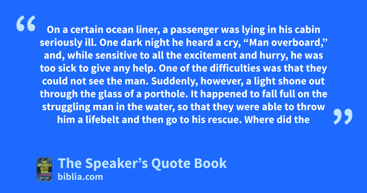 On a certain ocean liner, a passenger was lying in his cabin seriously ill. One dark night he heard a cry, “Man overboard,” and, while sensitive to all the excitement and hurry, he was too sick to give any help. One of the difficulties was that they could not see the man. Suddenly, however, a light shone out through the glass of a porthole. It happened to fall full on the struggling man in the water, so that they were able to throw him a lifebelt and then go to his rescue. Where did the