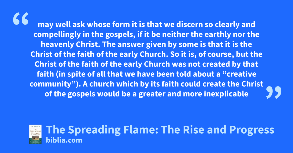 may well ask whose form it is that we discern so clearly and compellingly in the gospels, if it be neither the earthly nor the heavenly Christ. The answer given by some is that it is the Christ of the faith of the early Church. So it is, of course, but the Christ of the faith of the early Church was not created by that faith (in spite of all that we have been told about a “creative community”). A church which by its faith could create the Christ of the gospels would be a greater and more inexplicable