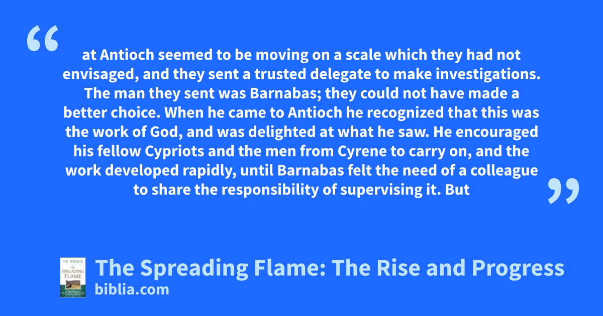 at Antioch seemed to be moving on a scale which they had not envisaged, and they sent a trusted delegate to make investigations. The man they sent was Barnabas; they could not have made a better choice. When he came to Antioch he recognized that this was the work of God, and was delighted at what he saw. He encouraged his fellow Cypriots and the men from Cyrene to carry on, and the work developed rapidly, until Barnabas felt the need of a colleague to share the responsibility of supervising it. But