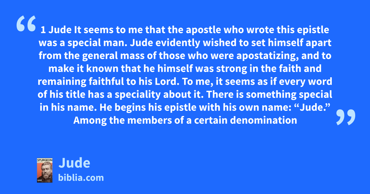 1 Jude It seems to me that the apostle who wrote this epistle was a special man. Jude evidently wished to set himself apart from the general mass of those who were apostatizing, and to make it known that he himself was strong in the faith and remaining faithful to his Lord. To me, it seems as if every word of his title has a speciality about it. There is something special in his name. He begins his epistle with his own name: “Jude.” Among the members of a certain denomination