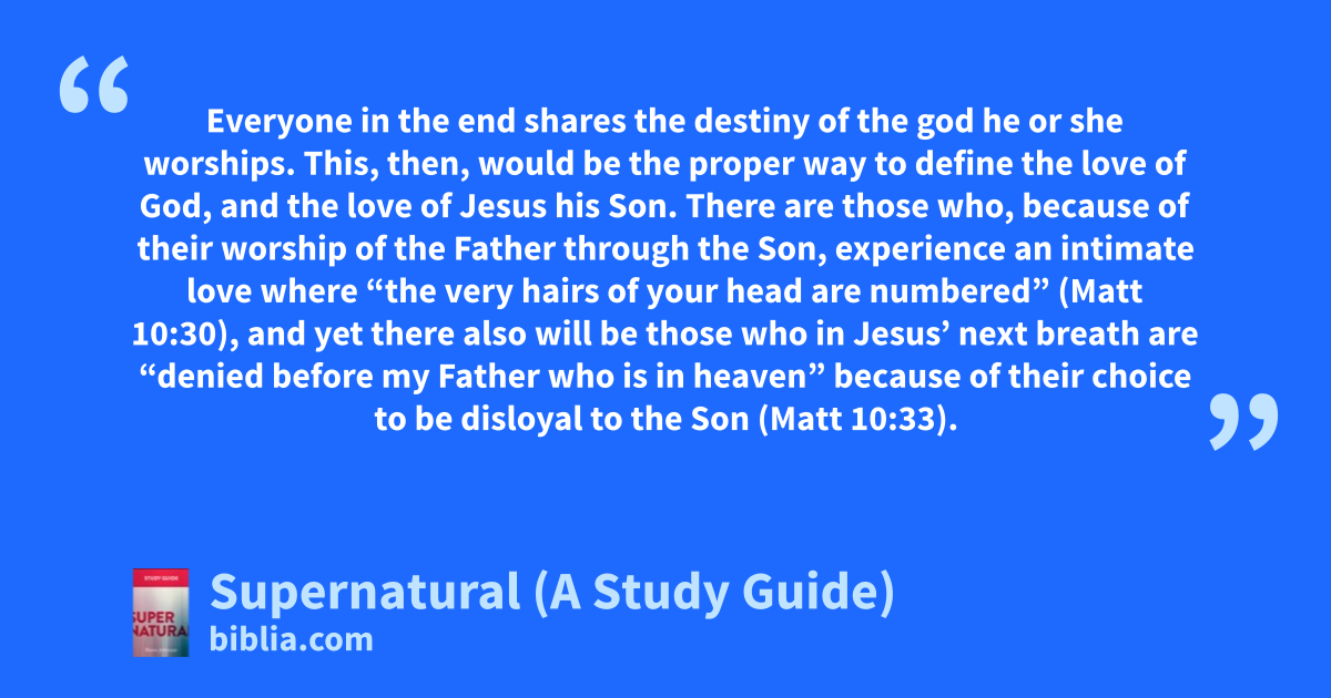 Everyone in the end shares the destiny of the god he or she worships. This, then, would be the proper way to define the love of God, and the love of Jesus his Son. There are those who, because of their worship of the Father through the Son, experience an intimate love where “the very hairs of your head are numbered” (Matt 10:30), and yet there also will be those who in Jesus’ next breath are “denied before my Father who is in heaven” because of their choice to be disloyal to the Son (Matt 10:33).