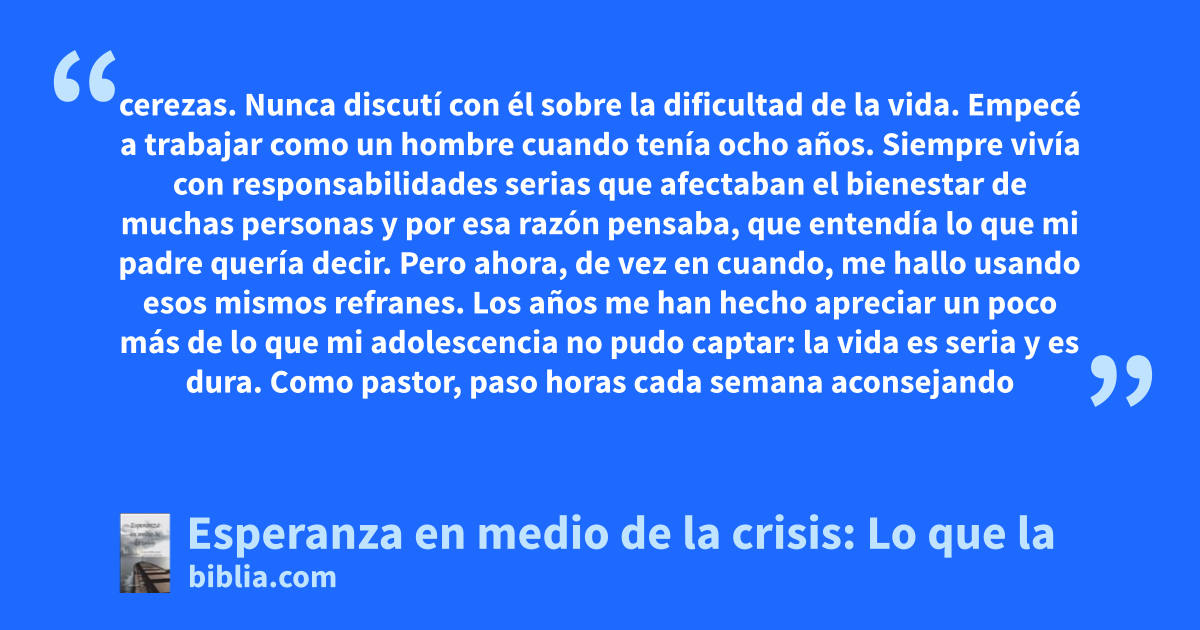 cerezas. Nunca discutí con él sobre la dificultad de la vida. Empecé a trabajar como un hombre cuando tenía ocho años. Siempre vivía con responsabilidades serias que afectaban el bienestar de muchas personas y por esa razón pensaba, que entendía lo que mi padre quería decir. Pero ahora, de vez en cuando, me hallo usando esos mismos refranes. Los años me han hecho apreciar un poco más de lo que mi adolescencia no pudo captar: la vida es seria y es dura. Como pastor, paso horas cada semana aconsejando