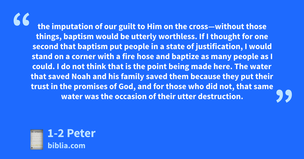 the imputation of our guilt to Him on the cross—without those things, baptism would be utterly worthless. If I thought for one second that baptism put people in a state of justification, I would stand on a corner with a fire hose and baptize as many people as I could. I do not think that is the point being made here. The water that saved Noah and his family saved them because they put their trust in the promises of God, and for those who did not, that same water was the occasion of their utter destruction.