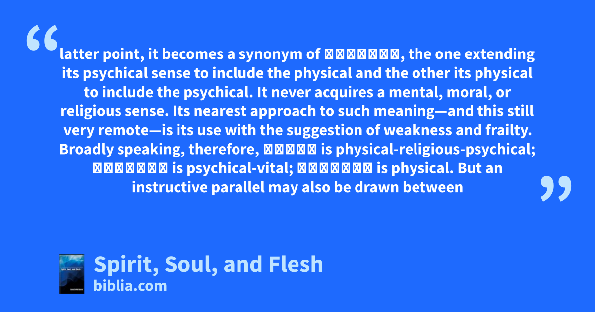 latter point, it becomes a synonym of נֶ֣פֶשׁ, the one extending its psychical sense to include the physical and the other its physical to include the psychical. It never acquires a mental, moral, or religious sense. Its nearest approach to such meaning—and this still very remote—is its use with the suggestion of weakness and frailty. Broadly speaking, therefore, רוּחַ is physical-religious-psychical; נֶ֣פֶשׁ is psychical-vital; בָּשָׂר is physical. But an instructive parallel may also be drawn between