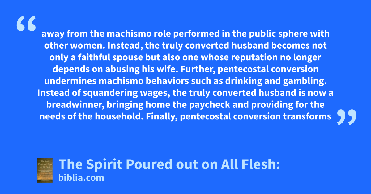 away from the machismo role performed in the public sphere with other women. Instead, the truly converted husband becomes not only a faithful spouse but also one whose reputation no longer depends on abusing his wife. Further, pentecostal conversion undermines machismo behaviors such as drinking and gambling. Instead of squandering wages, the truly converted husband is now a breadwinner, bringing home the paycheck and providing for the needs of the household. Finally, pentecostal conversion transforms