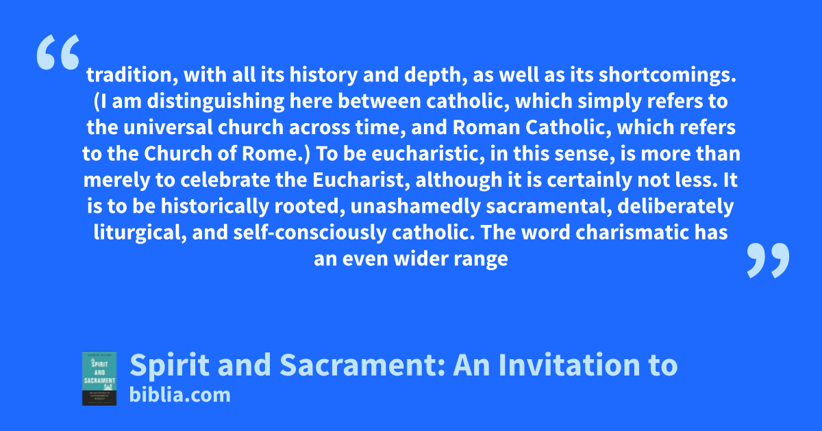 tradition, with all its history and depth, as well as its shortcomings. (I am distinguishing here between catholic, which simply refers to the universal church across time, and Roman Catholic, which refers to the Church of Rome.) To be eucharistic, in this sense, is more than merely to celebrate the Eucharist, although it is certainly not less. It is to be historically rooted, unashamedly sacramental, deliberately liturgical, and self-consciously catholic. The word charismatic has an even wider range