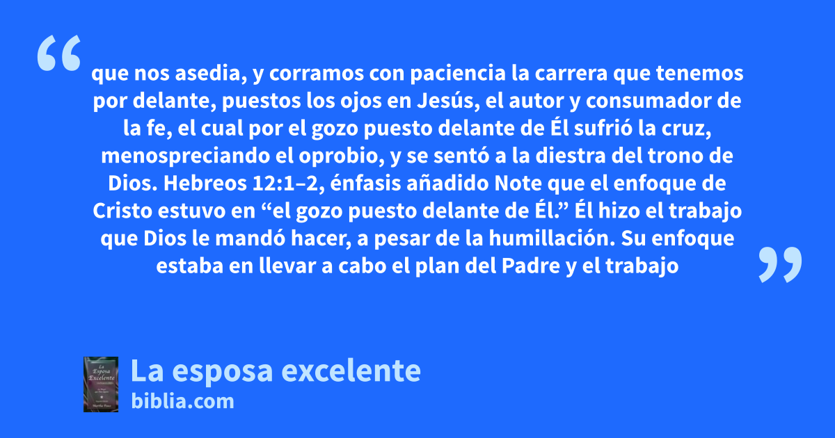 que nos asedia, y corramos con paciencia la carrera que tenemos por delante, puestos los ojos en Jesús, el autor y consumador de la fe, el cual por el gozo puesto delante de Él sufrió la cruz, menospreciando el oprobio, y se sentó a la diestra del trono de Dios. Hebreos 12:1–2, énfasis añadido Note que el enfoque de Cristo estuvo en “el gozo puesto delante de Él.” Él hizo el trabajo que Dios le mandó hacer, a pesar de la humillación. Su enfoque estaba en llevar a cabo el plan del Padre y el trabajo