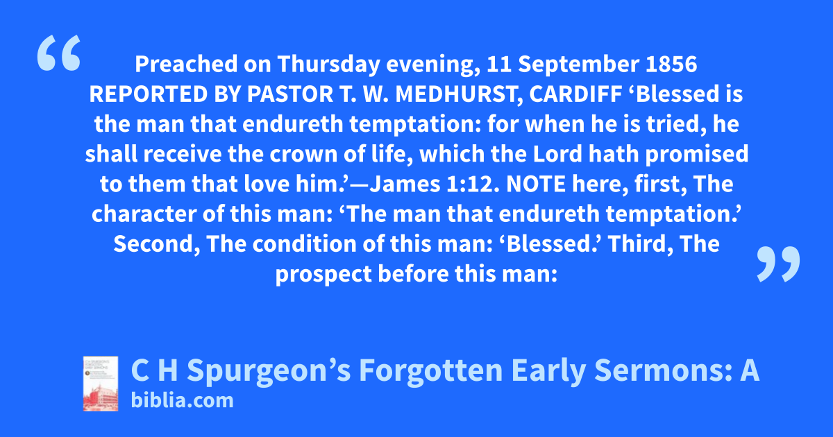 Preached on Thursday evening, 11 September 1856 REPORTED BY PASTOR T. W. MEDHURST, CARDIFF ‘Blessed is the man that endureth temptation: for when he is tried, he shall receive the crown of life, which the Lord hath promised to them that love him.’—James 1:12. NOTE here, first, The character of this man: ‘The man that endureth temptation.’ Second, The condition of this man: ‘Blessed.’ Third, The prospect before this man: