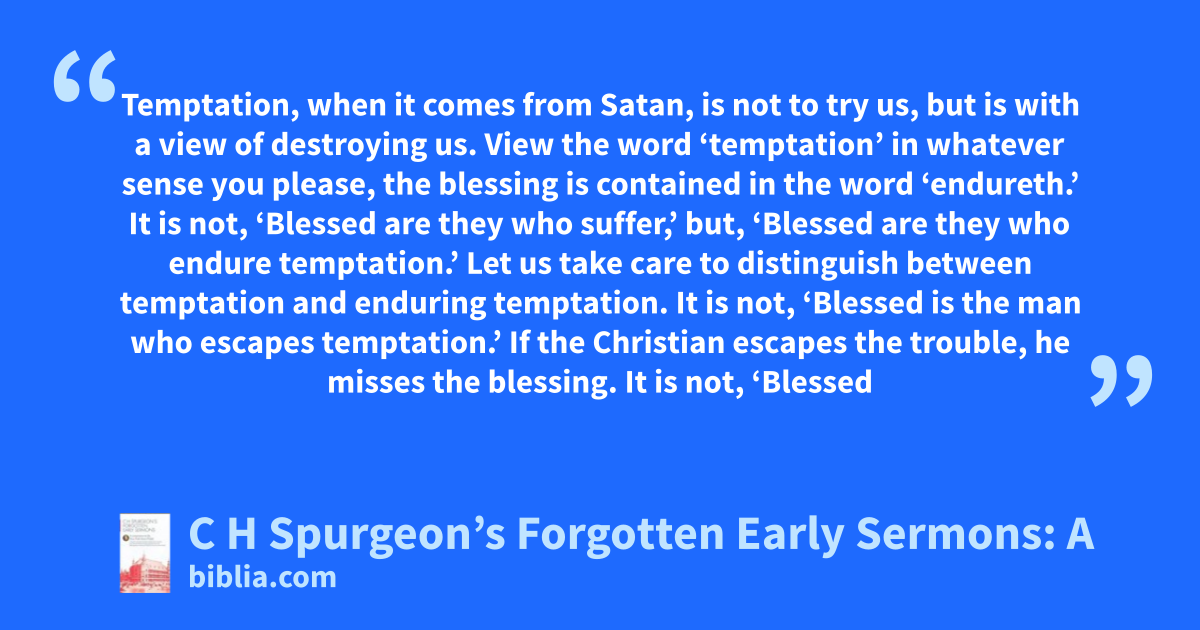 Temptation, when it comes from Satan, is not to try us, but is with a view of destroying us. View the word ‘temptation’ in whatever sense you please, the blessing is contained in the word ‘endureth.’ It is not, ‘Blessed are they who suffer,’ but, ‘Blessed are they who endure temptation.’ Let us take care to distinguish between temptation and enduring temptation. It is not, ‘Blessed is the man who escapes temptation.’ If the Christian escapes the trouble, he misses the blessing. It is not, ‘Blessed
